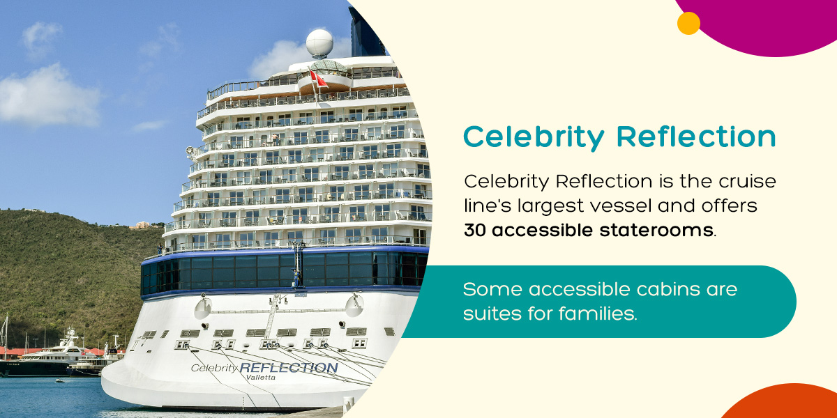 Celebrity Reflection is the cruise line’s largest vessel and offers 30 accessible staterooms. Some accessible cabins are suites for families. Features of accessible cabins include: