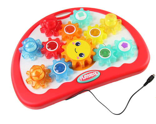 Stack, sort and explore how gears work with this switch-adapted learning toy. Touch the button or use your external capability switch and watch the gears spin, music play and lights flash. Take the gears off to count, play color matching games, and reveal shapes on the pegs. Connect them to the center wheel and they spin again and again. Encourages fine motor skills, spatial awareness, and cause-and-effect understanding. On/off button conserves battery power.
