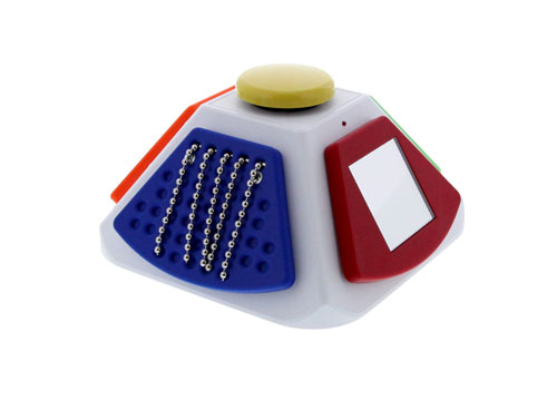 This compact-size busy box will provide hours of fun and multisensory stimulation. Spin the cube and discover diverse tactile experiences, mirror, bead chains, multicolored lights, music and vibration. Press the cube’s red plate to hear your 10-second pre-recorded message.
