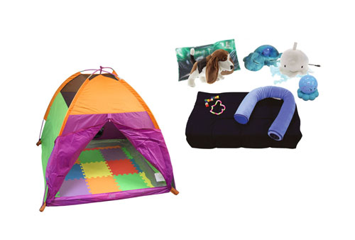 All children love tents! We have filled this tent with items to stimulate every sense—providing a calming, private place for a child to relax and explore. This sturdy tent has two openings and an easy-view screen at the top for checking on your child. Tent size: 48″L x 48″W x 42″H.