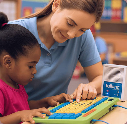 Generate speech just by typing on a keyboard—without spending a fortune. These Talking Keyboards are a keyboard and speaker combination for non-speaking adults and kids who can operate a standard keyboard. Just type your message and the speaker responds with a male or female voice in English or Spanish. No PC or tablet is required. Options include the Wireless Standard keyboard and the wired K-12 Keyboard. Both can speak 30 user-defined phrases with a single key press. USB charging cord and wall plug included. Wireless Standard Size: 2¼”L x 6″W x ½”H. USB Rechargeable. Weight: ¾ lbs. K-12 Keyboard Size: 6½”L x 17¾”W x ¾”H. USB Rechargeable. Weight: 2 lbs. Speaker Size: 6″L x 4″W x 2″H. USB Rechargeable. Weight: ½ lb.