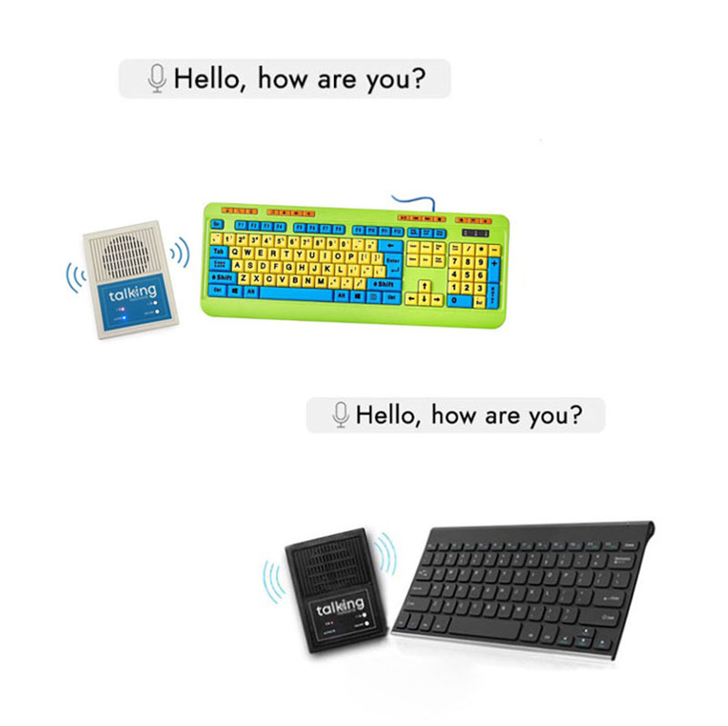 Generate speech just by typing on a keyboard—without spending a fortune. These Talking Keyboards are a keyboard and speaker combination for non-speaking adults and kids who can operate a standard keyboard. Just type your message and the speaker responds with a male or female voice in English or Spanish. No PC or tablet is required. Options include the Wireless Standard keyboard and the wired K-12 Keyboard. Both can speak 30 user-defined phrases with a single key press. USB charging cord and wall plug included. Wireless Standard Size: 2¼”L x 6″W x ½”H. USB Rechargeable. Weight: ¾ lbs. K-12 Keyboard Size: 6½”L x 17¾”W x ¾”H. USB Rechargeable. Weight: 2 lbs. Speaker Size: 6″L x 4″W x 2″H. USB Rechargeable. Weight: ½ lb.